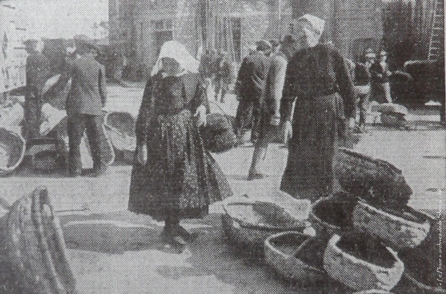 « Entre les femmes qui ont fini leur marché ou au beurre ou aux poulets ou aux canards, des vieux passent et s’arrêtent de baraque en baraque, portant comme prétexte au voyage – car ils n’ont pas grand’ chose à vendre – un panier qui renfermait « une poule ou un coq réformés ».