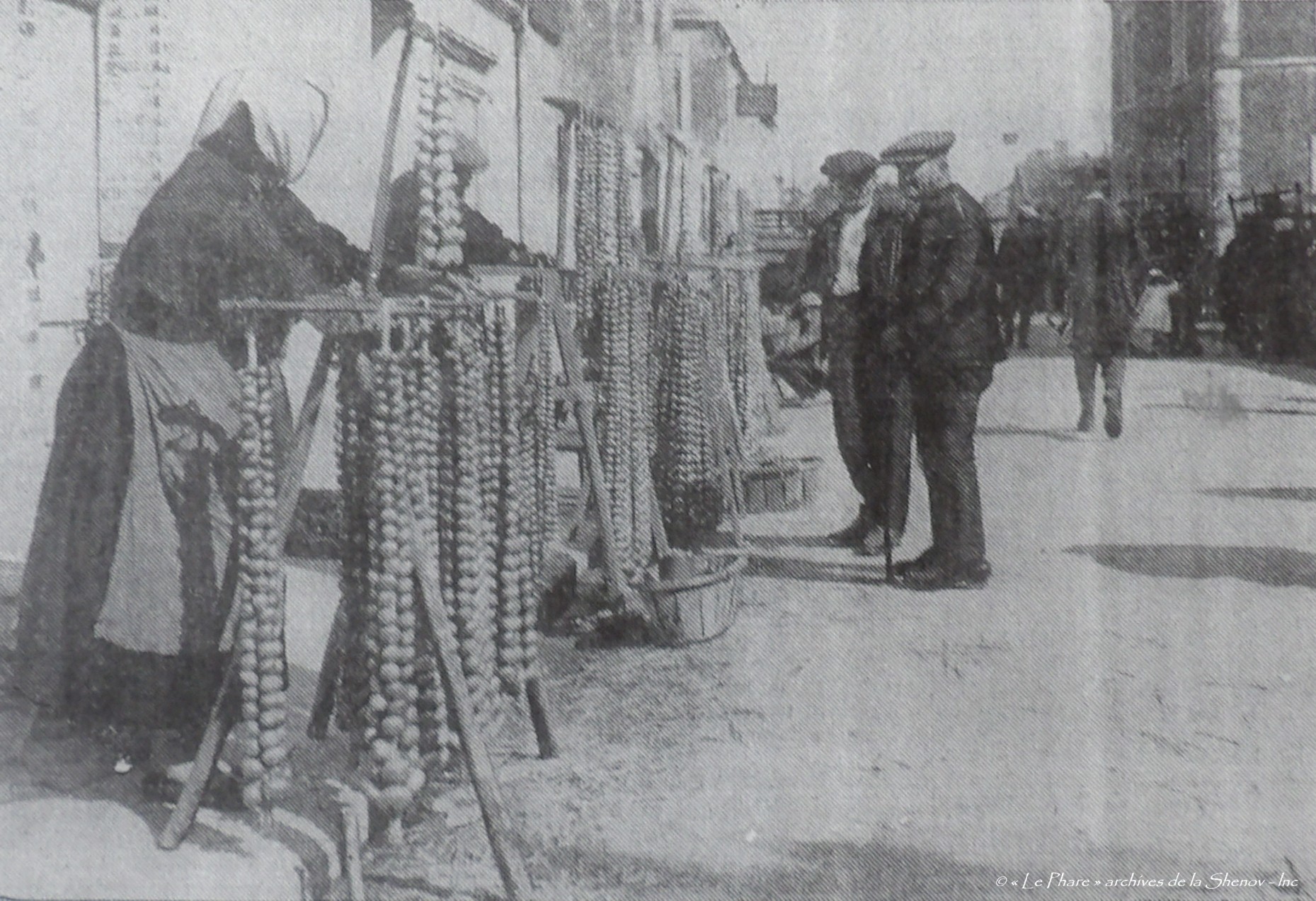 « Lundi, deuxième jour de la foire des Minées, fut (…) le jour de vente des aulx et des bois. Les mêmes marchands restaient pour le mardi. Ils étaient tous là, marchands d’ail habitant le pays de Challans et de l’entre Saint-Gilles : tout le long des trottoirs, ils attendaient les acheteurs, installés derrière leurs étalages. Et quel pittoresque ils présentaient, derrière ces sortes d’échalas où pendent les « tricottes » d’aulx, d’oignons, d’échalotes. « Ces fameux oignons, qui ont donné le nom à la foire, montés en liasses à deux branches », bien propres, « brillant comme le cerisier des armoires », certains font le voyage de la Roche-sur-Yon uniquement pour en acheter deux ou trois « tricottes » qu’ils échangent pièce contre cent sous ».