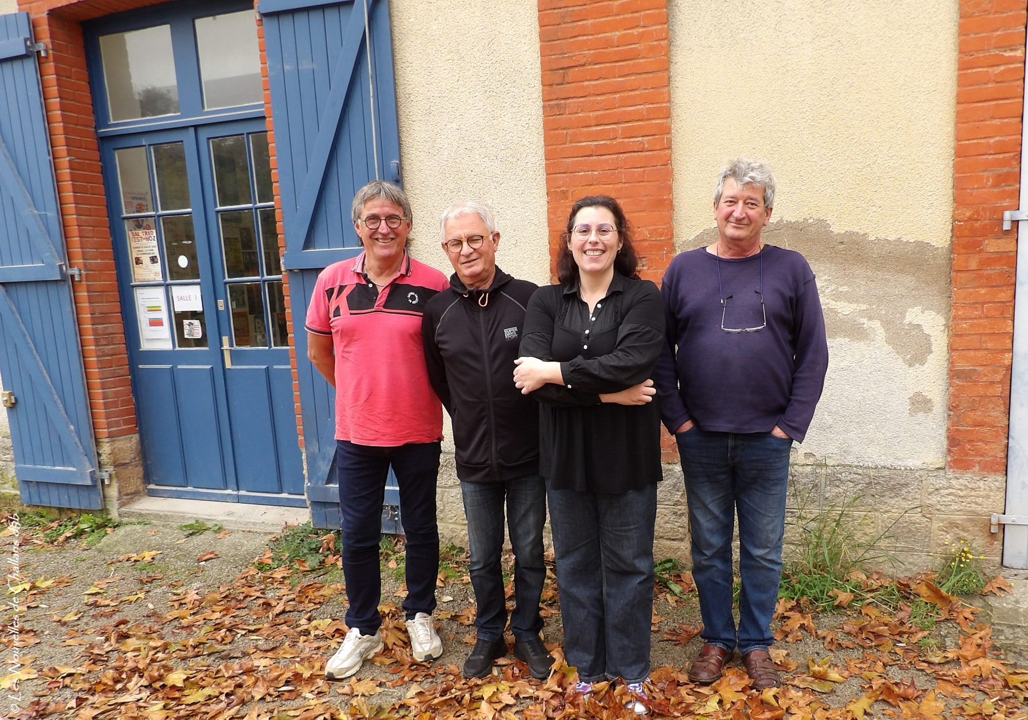 Dans les feuilles d’automne, lors de la présentation du festival : Patrick Minguet (veuzou depuis 17 ans, vice-trésorier de l’Ecole de veuze ; Marc Palvadeau, veuzou et ancien président de l’association ; Audrey Perdrieau, veuzounette, actuelle présidente ; et Thierry Bertrand – l’un des quatre fondateurs de l’école, entre autres professeur de veuze, musicien professionnel, luthier… (photo prise à l’ancienne gare de La Garnache, siège de l’Ecole de veuze – LNC)
