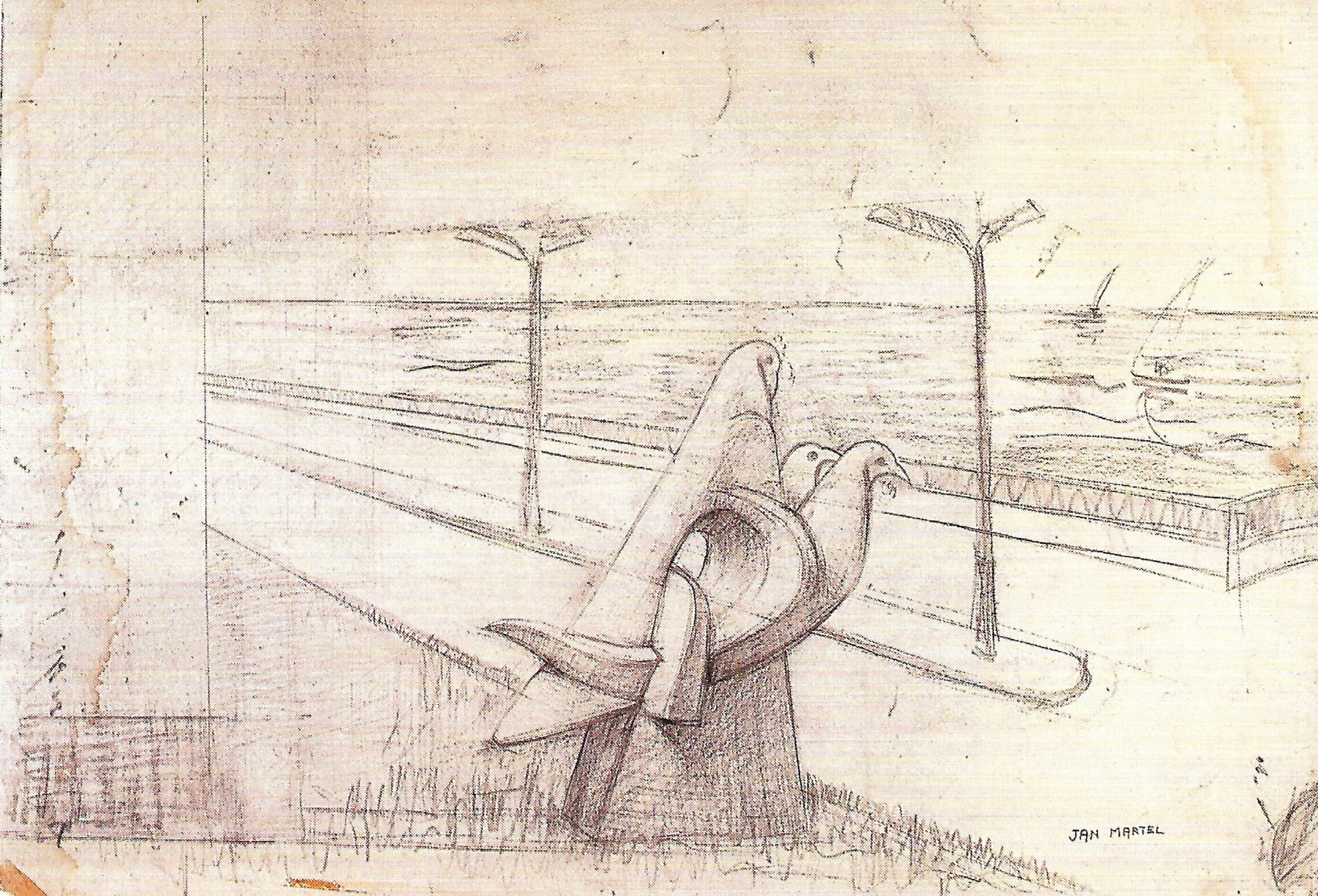 Les œuvres des frères Martel sont le plus souvent signées « J. J. Martel » (Jan et Joël Martel), mais Les Oiseaux de mer ne portent que la signature « J. Martel. » En 1996, Lise-Laure Forney-Martel, fille de Jan Martel et de Louise Simoneau-Martel, est interviewée par Françoise Mialet, responsable des expositions à l’Hôtel du département de la Vendée (1), et elle explique, entre autres, qu’elle a pour cette sculpture « le souvenir précis de (son) père (seul) au travail, car Joël, malade à cette date, n’a pas dû y participer. » Joël Martel était atteint de la terrible Maladie de Charcot – maladie neurodégénérative grave, paralysante, et fatale… Mais ce fut aussi la dernière oeuvre monumentale de Jan Martel…